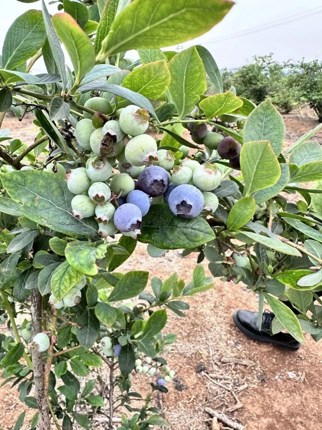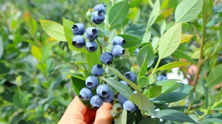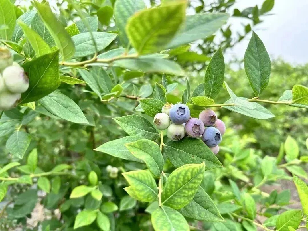一棵棵蓝莓树上缀满了蓝紫色的果子