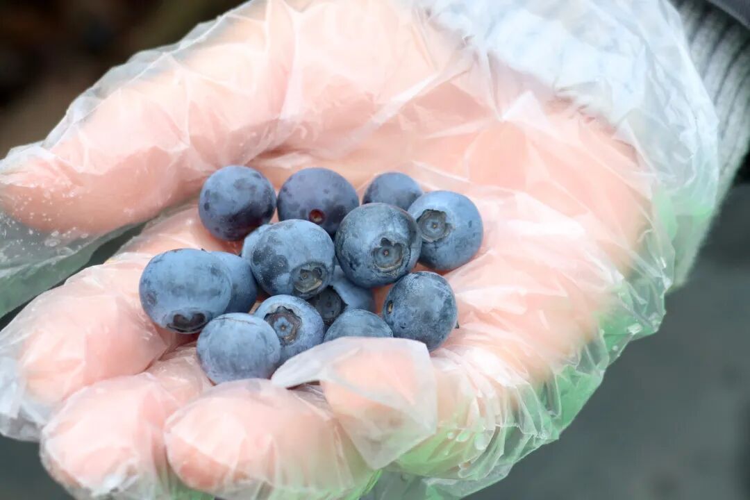 将成熟的蓝莓从枝头上轻轻地摘下来