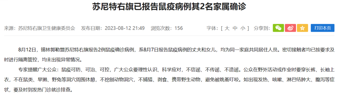 内蒙古锡林郭勒盟苏尼特右旗政府官网发布通知公告:苏尼特右旗报告2例鼠疫确诊病例,系8月7日报告鼠疫病例的丈夫和女儿,均为同一家庭共同居住人员。密切接触者均已按要求及时进行隔离管控,均未出现异常情况。