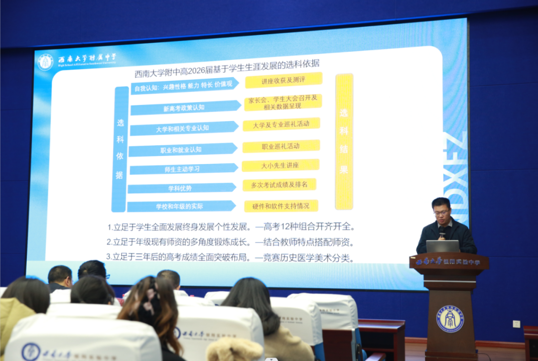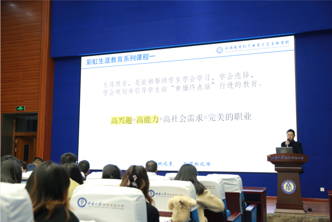 “生涯教育,是能够帮助学生学会学习,学会选择,学会规划并引导学生向‘幸福终点站’行进的教育。”荣昌校区的彩虹生涯教育系列课程是李彬彬主任此次汇报的一大亮点,他们以生涯规划教育作为此次选科分班的助推剂,因校制宜,确定出适宜荣昌校区的选科分班策略。