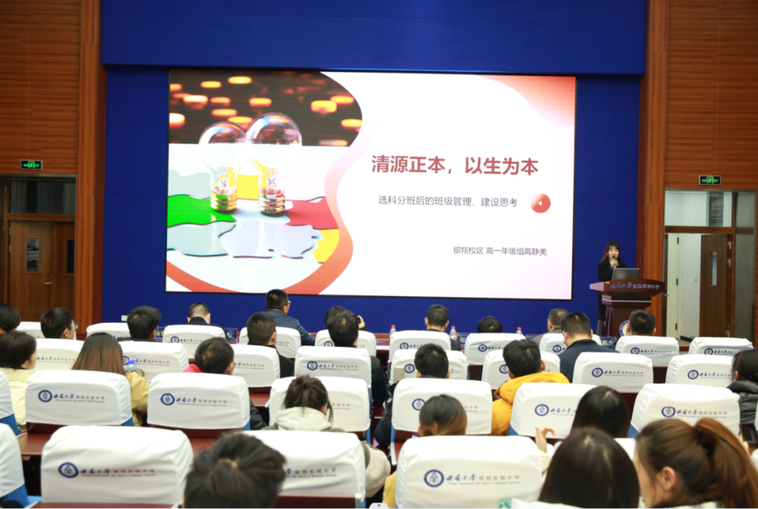 梅建波主任以选科分班的具体操作流程以及对新班组建后的后期思考作为汇报的主要思路,详细且深刻地介绍银翔高一年级的选科分班状况。对于选科分班,何时启动、如何选科、如何分班、师资如何搭配、有何事务准备,梅建波主任均结合了银翔校区的具体情况进行了细致而周到的筹备。面对分班后的工作,则是提出了常规整顿,强化管理;文化建设,凝练团队;专项提升,多元发展这三条建议,为各个校区的具体工作推进提出了参考。