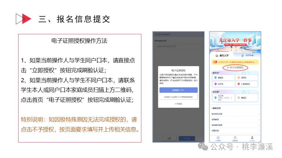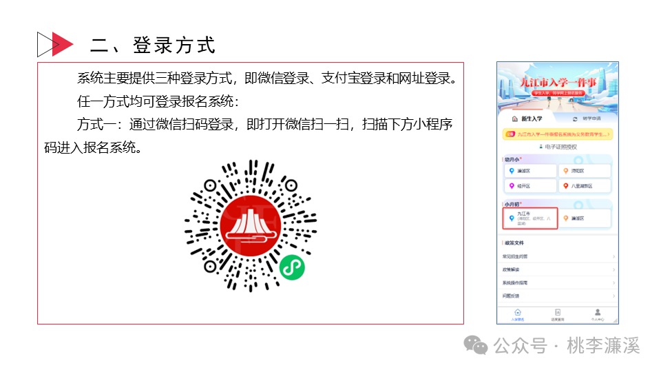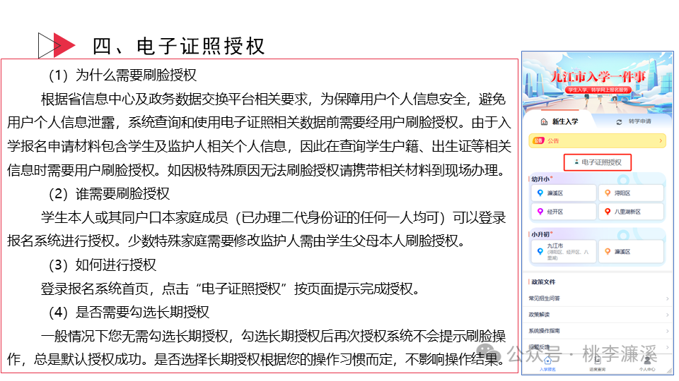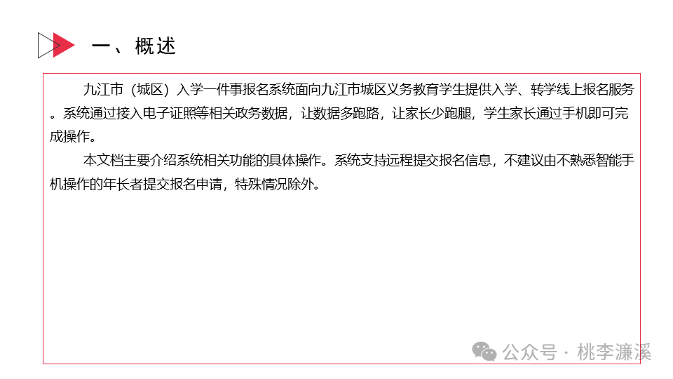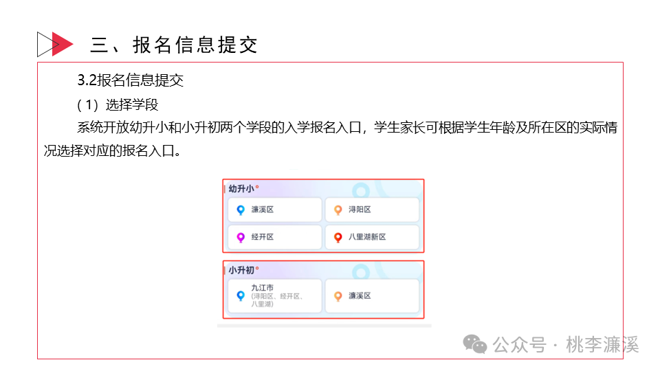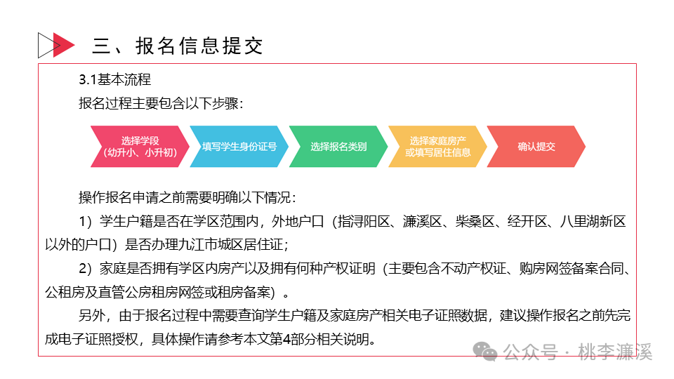 为深入推进我区义务教育入学“高效办成一件事”,确保“九江义务教育智慧入学数字平台”阳光招生系统上线运行,进一步提高我区义务教育招生入学工作科学化、规范化和制度化水平,切实规范公办义务教育学校招生入学秩序,健全公平入学长效机制,促进教育公平,根据《江西省教育厅关于进一步做好义务教育免试就近入学工作的实施意见》(赣教基字〔2024〕1号)和《江西省义务教育阳光招生专项行动(2024)实施方案》(赣教基字〔2024〕12号)等文件精神,从2024年秋季开始濂溪区将全面推广《九江义务教育智慧入学数字平台》线上入学报名工作。现将有关报名流程进行公告。