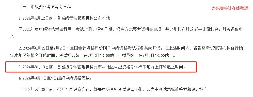根据财政部发布的《关于2024年度全国会计专业技术资格考试考务日程安排及有关事项的通知》可知:2024年8月13日前,各省级考试管理机构公布本地区中级资格考试准考证网上打印起止时间。