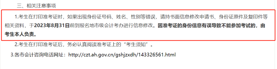 考生在打印准考证时,如果出现身份证号码、姓名、性别等错误,请持书面信息修改申请书、身份证原件及复印件等相关资料,于2023年8月31日前到报名地市级会计考办进行信息修改。