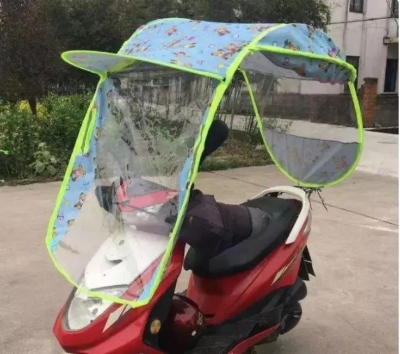 在电动车上加个车篷或遮阳伞虽然遮阳又挡雨,但也会挡住视线,而且还会增加车子的风阻,大风天气里车子容易失去平衡,一不小心就可能出事故。