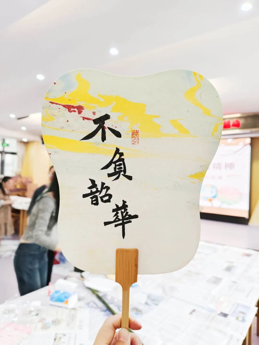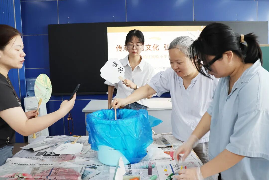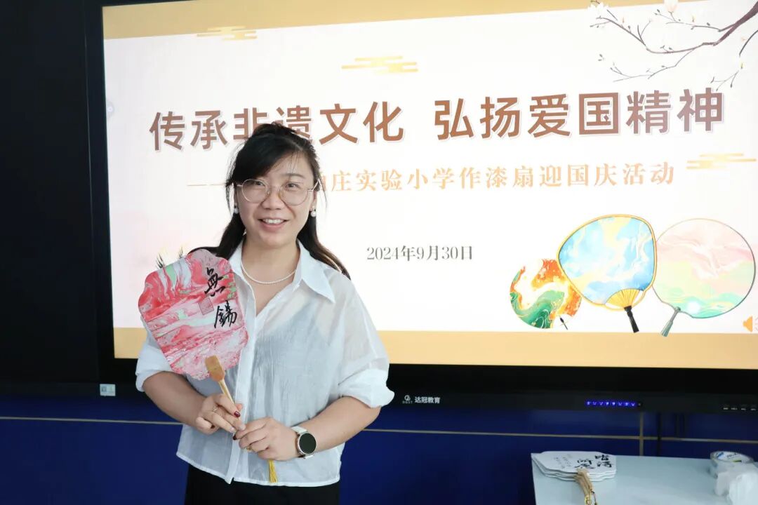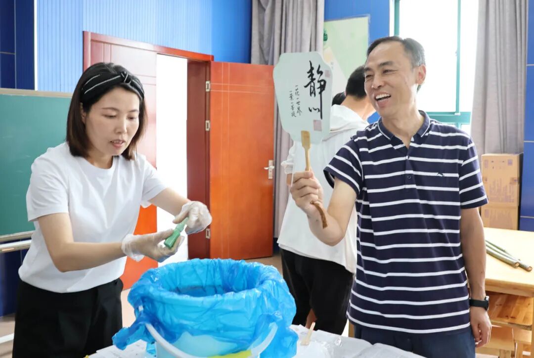 非遗漆扇,以漆为媒,以扇为载,传递着东方美学的精髓。悠悠古韵,从指尖上传来的,是中华民族历史的温度;罗扇轻摇,从微风中吹来的,是中华民族文化的底蕴。老师们在清水中滴入漆液,再将纸扇入水,一把把绚丽独特的漆扇如出水芙蓉般“绽放”,或清新淡雅,或艳丽夺目,成为节日里的一道锦绣华彩。
