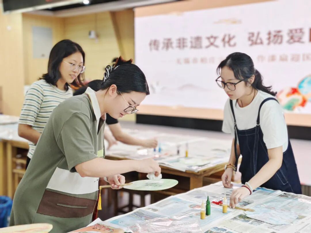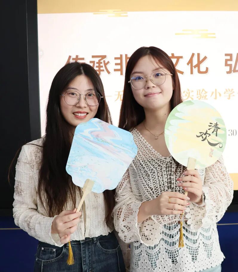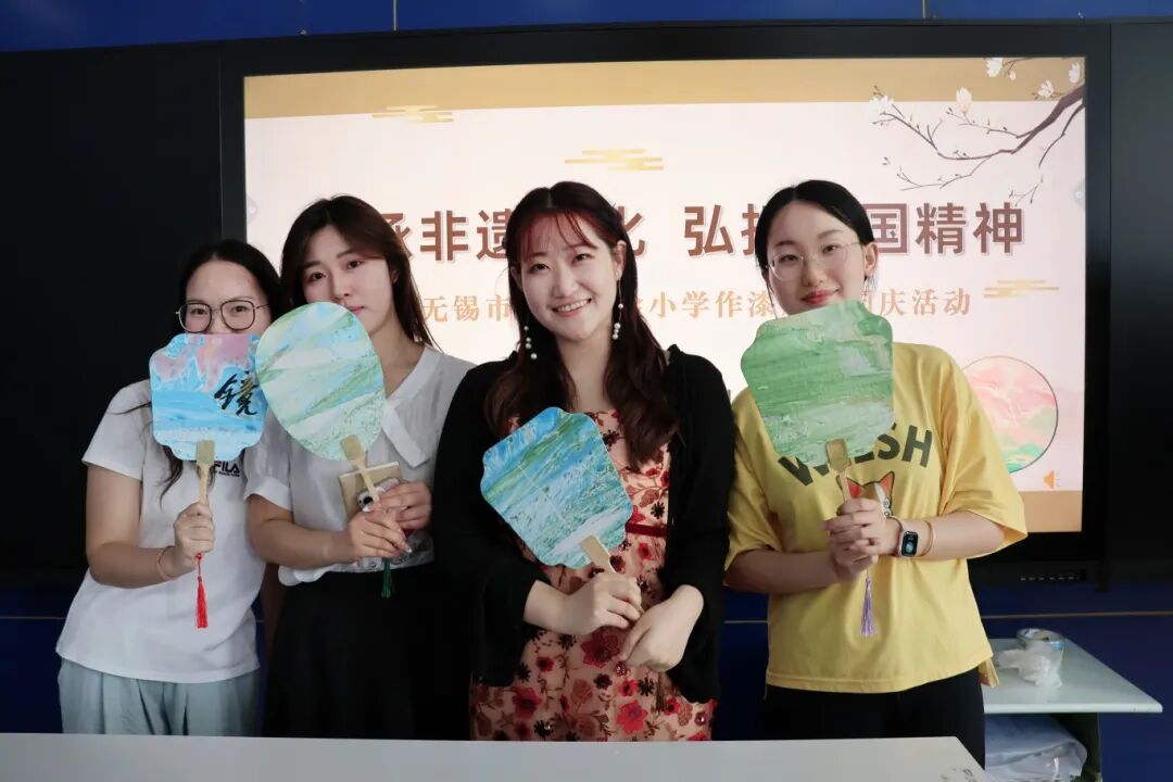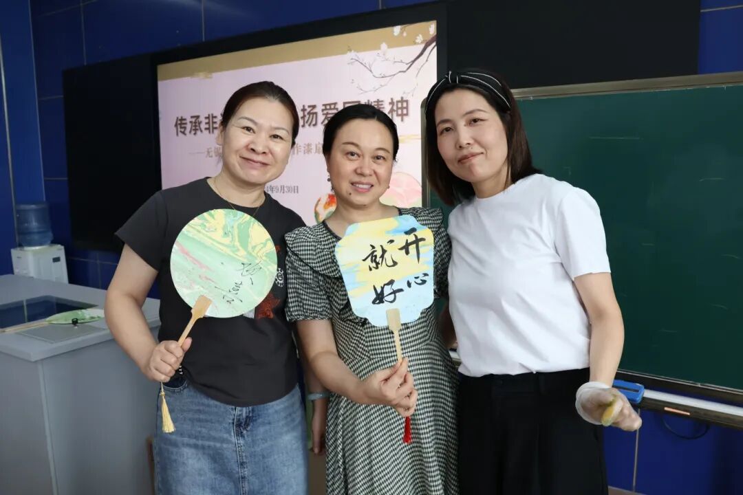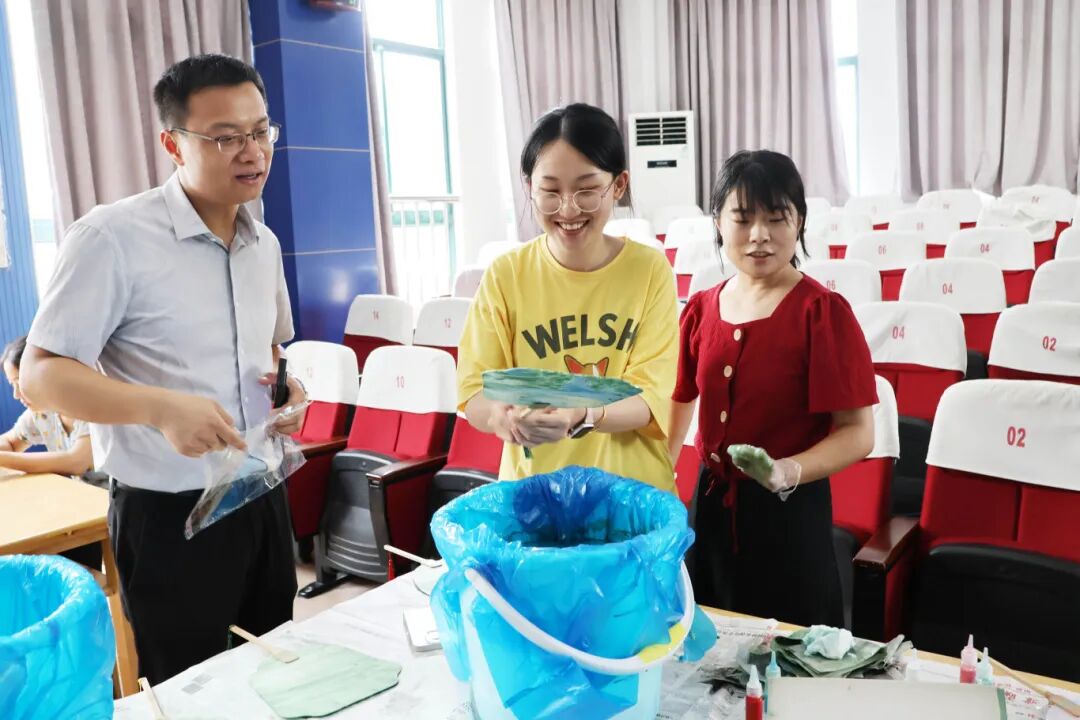 非遗漆扇,以漆为媒,以扇为载,传递着东方美学的精髓。悠悠古韵,从指尖上传来的,是中华民族历史的温度;罗扇轻摇,从微风中吹来的,是中华民族文化的底蕴。老师们在清水中滴入漆液,再将纸扇入水,一把把绚丽独特的漆扇如出水芙蓉般“绽放”,或清新淡雅,或艳丽夺目,成为节日里的一道锦绣华彩。