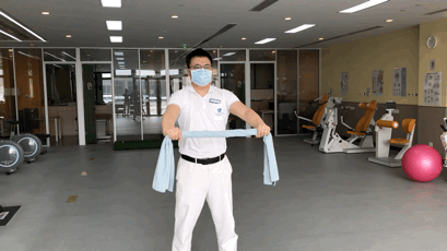 身体前屈,将毛巾拉紧并将两侧胳膊举到耳边。夹紧上背部肌肉,将胳膊向天花板举起,然后放松回到起始位。做几次后,将会感觉两侧肩背部肌肉都在发力。
