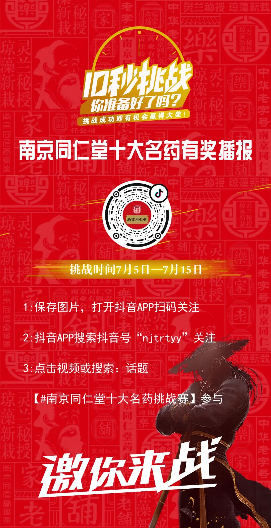 2020年7月5日~7月15日,南京同仁堂名药开“抖”,通过企业【抖音号njtrtyy】,开展“南京同仁堂十大名药有奖播报挑战赛”,以趣味纷呈的有奖互动,将十大名药以崭新的面貌、激昂的动态带到大家面前。活动详情请打开抖音,搜索话题【#南京同仁堂十大名药挑战赛】,心动大奖,邀你来战!