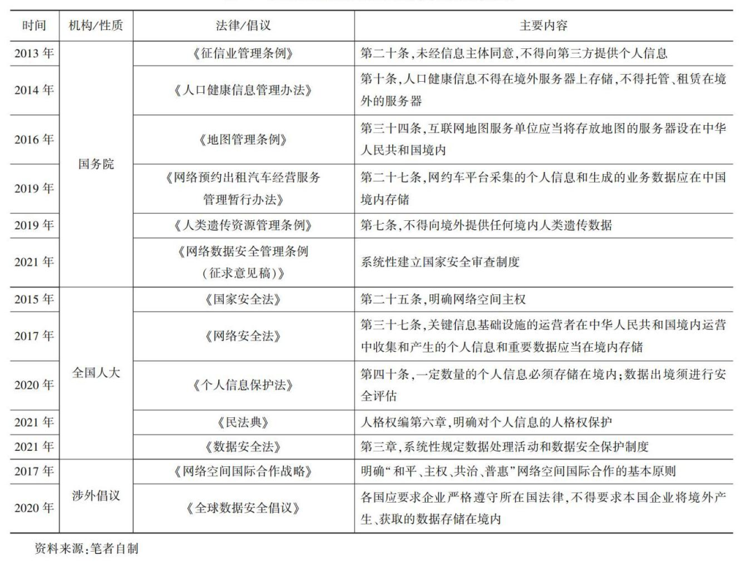 新一代信息技术革命将人类社会整体推入数字时代,而数据作为资本的载体成为国家核心战略资源,也成为大国战略竞争的关键。数据的跨境流动在创造巨大价值的同时,也触发了个人隐私、产业竞争和国家安全等方面的潜在威胁。跨境数据的政策博弈关乎经济发展、国家安全和国际秩序,是保障数据权益、推进国家治理现代化、引导国际贸易规则制定,以及参与全球数据治理的重要议题。2014年,麦肯锡研究院发布报告《数字时代的全球流动∶贸易、金融、人和数据如何连接全球经济》(Global Flows in a Digital Age: How Trade,Finance, People, and Data Connect the World Economy),该报告将数据与商品、服务、金融、劳动力并列为全球“五流”,并指出全球年GDP因五项要素的流动而增长15%至25%,达4500亿美元,连通性越高的国家收益越高。2017年习近平在中共中央政治局进行第二次集体学习时指出,“在互联网经济时代,数据是新的生产要素,是基础性资源和战略性资源,也是重要生产力。”各主要国家为了控制数据资源,开始纷纷推出自己的数据战略,以求在未来的数字竞争中取得先机。基于上述背景,本文意在通过对中美两国跨境数据流动政策加以对比,探究两国政策差异背后的核心分歧及动因,从而为中国的应对提供借鉴。跨境数据流动涉及“跨境”和“数据”两个词在概念上的明确定义,同时此术语又与各国的政策紧密相连。在大国竞争的国际地缘政治背景下,跨境数据流动的政治色彩愈加浓厚,因此有必要先对相关概念进行界定和厘清。跨境数据流动是在社会发展的特定阶段出现的一种历史现象,是伴随着科技进步尤其是网络技术的发展而出现的。20世纪70年代,诸如“跨境数据流动”(cross/trans-border data flows)、“跨境个人数据流动”(cross/trans-border flows of personal data)、“国际信息转移”(international information transfer)等相关概念开始出现,彼时的焦点多放在个人数据的跨境流动上,且未对“数据(data)”和“信息(information)”在概念上进行区分。事实上,直到今日两者的关系仍然含混交织,以至于学术界通常将其视作同义词使用。尽管严格意义上讲,信息是有意义的数据,数据不仅包括信息,还包括未经加工的无意义数据。早期众多国际法律文本都将跨境数据的类型集中在“个人数据”上。1980年经合组织(OECD)发布《隐私保护和个人数据跨境流动指南》(Guidelines Governing the Protection of Privacy and Transborder Flows of Personal Data,下文简称《OECD指南》),将 “个人数据”定义为已识别或可识别的自然人(数据主体)相关的任何信息。《欧盟通用数据保护条例》(General Data Protection Regulation,简称“GDPR”)也沿用了这一定义。但是随着通信技术和数字经济的发展,对政务数据、自然数据以及特定行业领域的数据跨境流动规制变得同样重要。因此“数据”的涵盖范围也相应扩大。在《跨太平洋伙伴关系协定》(Trans-Pacific Partnership Agreement,下文简称TPP)中,数据是指任何以电磁方式传输的信息,包括但不限于个人数据。2021年正式发布的《中华人民共和国数据安全法》中,数据被定义为“任何以电子或者其他方式对信息的记录”,这一定义扩大了数据的范围,更加符合时代发展的特征。因此在本文中,数据一词沿用了这一定义,即对“数据”采取广义认定的方式,既包括个人数据,也包括政府政务数据,还包括金融、科技、医疗、生物等关键特殊行业的数据。《OECD指南》将数据“跨境”定义为数据跨越国界传递,后续众多国内法和国际法律文本都沿用了这一解释,即都将“跨境”理解为跨越边境或者国界。而在GDPR中“跨境”显然指的是欧盟的“边境”,故有学者将“跨境”理解为司法管辖域,跨境数据流动则指代“数据在不同法域之间的流动”。鉴于中国大陆尚未与台湾统一的现状以及未来双边或多国达成区内数据流动共同规则的趋势,本文将“跨境”定义为数据跨越司法管辖域或多边条约规制域的传递。同样,对于“流动”一词,国际上大多采取扩大解释,即既包含数据单纯的流向域外,也包含在域外对本国数据的存储、使用、加工、传输等活动,本文延续了这一扩大解释。综上,本文认为“跨境数据流动”应当被定义为以电子或其他方式记录的信息跨越司法管辖域或条约规制域的读取、存储和处理活动。早期对于跨境数据的流动规则是由美欧等国建立的。不同国家和地区因为经济发展水平的差异对跨境数据流动的规制在实践上是不同步的,直至今日,跨境数据的全球规则体系仍未建立起来。但在当下数字空间态势中,美国和欧盟主导全球数据治理活动,另有中国、俄罗斯、越南等国家在理念和某些具体议题上提出自己的主张和政策实践。为了更好地对中美之间的政策分歧加以研究,本文首先对中美跨境数据流动政策的演进过程进行梳理。中国关于数据跨境传输的法律最早可追溯至1988年《保守国家秘密法》,该法第三十七条禁止含有国家秘密的数据流出中国。此时由于技术条件的限制,数据更多的是非电子形式的。在这之后,相关的法律法规建设发展缓慢,几乎陷入停滞状态。十八大之后,我国经济迅速数字化,规制数据跨境传输的政策越来越明朗,立法进程也大大加快,但此时的跨境数据流动规制大多分散在部门性的法律法规中(参见表一)。如2013年《征信业管理条例》规定征信机构采集信息的整理保存