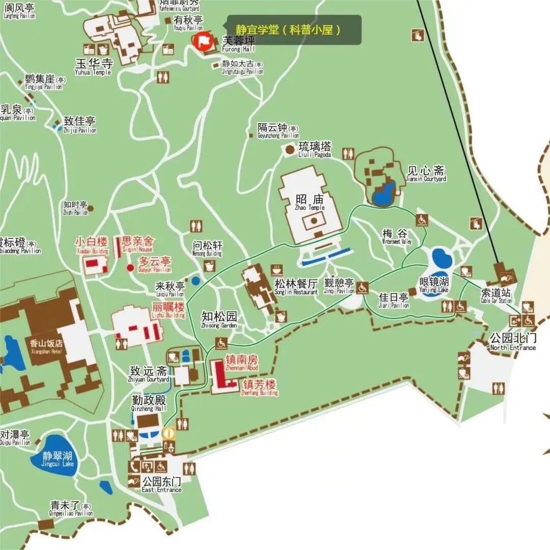 具体路线:进公园东门——穿知松园——自松林餐厅后门科普小径处上行——抵达芙蓉坪“静宜学堂”科普小屋