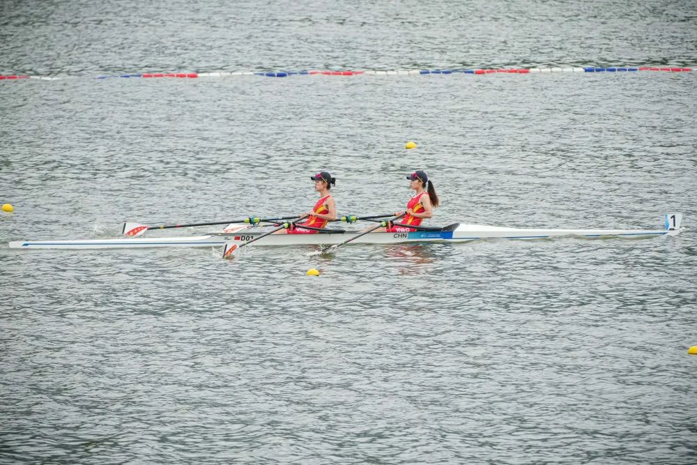 9月20日,中国组合邹佳琪(右)、邱秀萍在女子轻量级双人双桨预赛中。她们以6分52秒43的成绩晋级决赛。新华社记者 江汉 摄