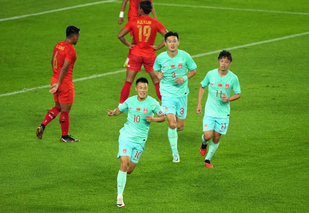 9月21日,中国队球员谭龙(前)在比赛中庆祝进球。当日,在杭州亚运会男子足球小组赛A组比赛中,中国队以4比0战胜缅甸队。新华社记者 李一博 摄