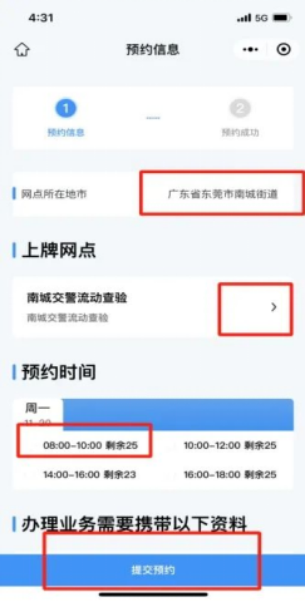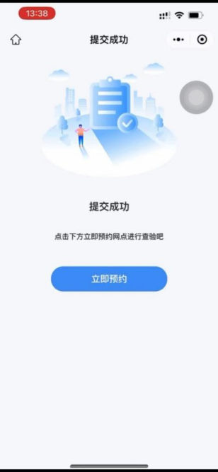 1.提交成功后,点击“立即预约”按钮,选择登记上牌点和具体时间(可预约当日)核验车辆,携带身份证明(委托办理还需提交受托人身份证明及授权委托书)、行驶证及车辆号牌(如遗失需签署遗失声明),按照预约的具体时间到约定的登记上牌点核验车辆;