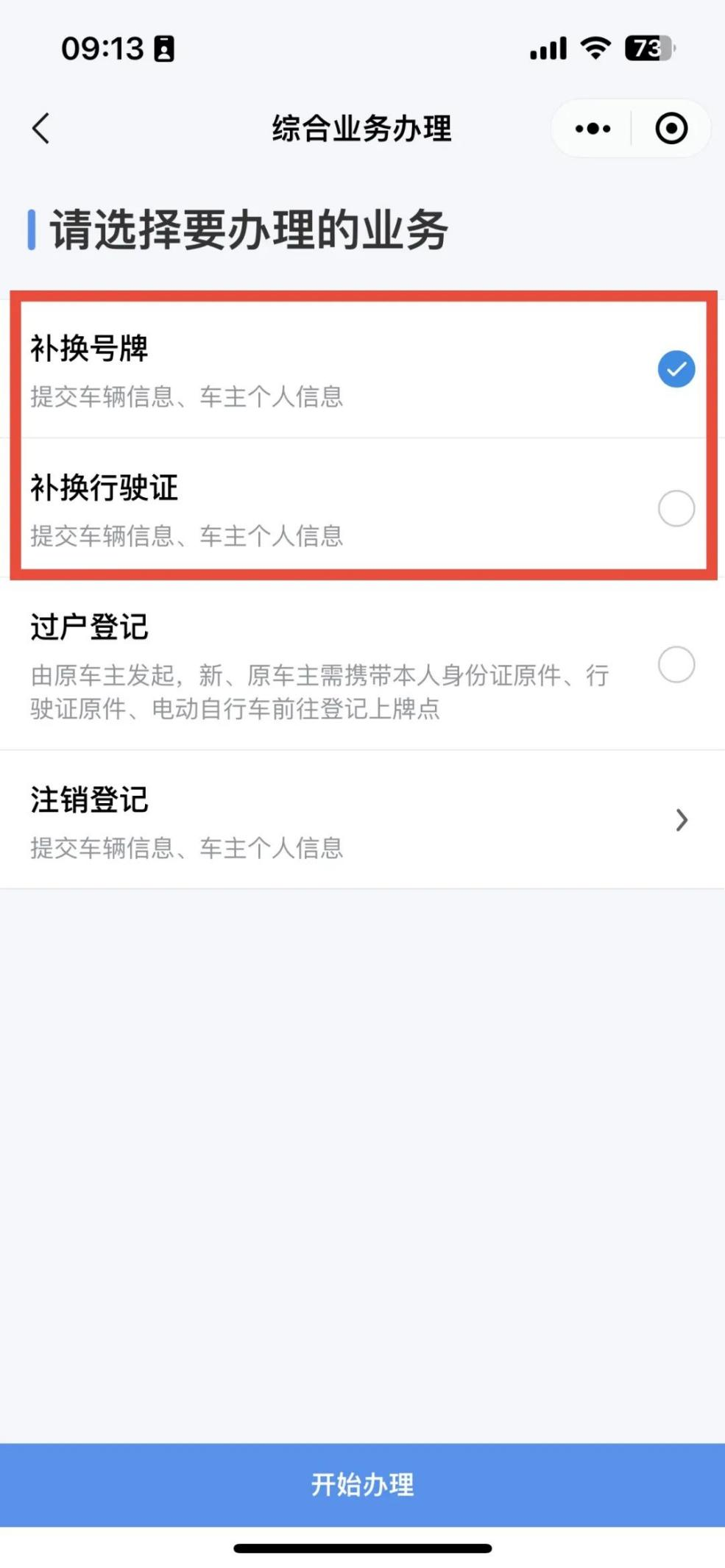 登录“东莞电动自行车”小程序,点击“电动自行车综合业务办理登记”,选择“补换号牌”或“补换行驶证”业务,点击最下方蓝色一栏的“开始办理”按钮,进行实名认证,拍摄车辆左前方45度的照片(如系统缺失)并上传,填写个人和车辆信息后,在《电动自行车补换牌证申请表》签名确认。