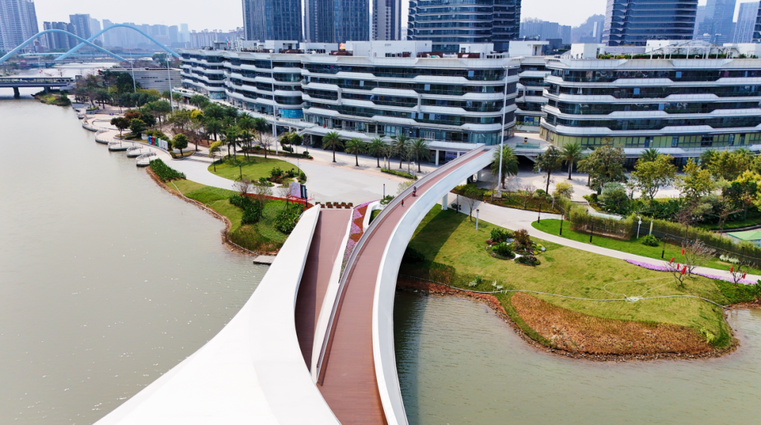 融通大厦前人行桥主要功能为连通融通大厦前蕉门河碧道,保证蕉门河碧道的连续性,主要功能是服务于休闲建设人群。相比前三座桥,此桥以卧虹的形式切入场地并串联景观空间,轻盈的弧线跨越 30 米的水道后,向两侧延伸。