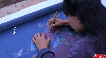 接着设计图案,再将布料固定住,用特殊的笔勾画轮廓,也就是“上料”。