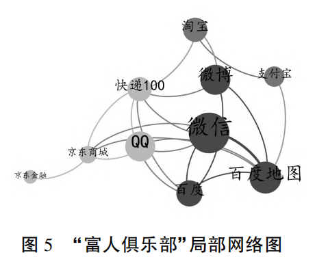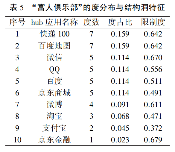 由表5可知,“富人俱乐部”局部网络度分布较为均匀,集中程度较低,各节点限制度指标相差较小,说明“富人俱乐部”网络较为均匀,不存在明显的结构洞特征。除了京东金融对京东商城有依赖,枢纽节点之间的依赖程度较弱外(枢纽节点之间不存在明显的路径依赖现象,存在较强的竞争关系),总体来说,整体网络对枢纽节点的路径依赖较强,而枢纽节点之间的路径依赖较弱。这种网络结构既能提高整体网络的路由效率,又具有一定的社群隔离特征,形成个人数据的竞争格局。