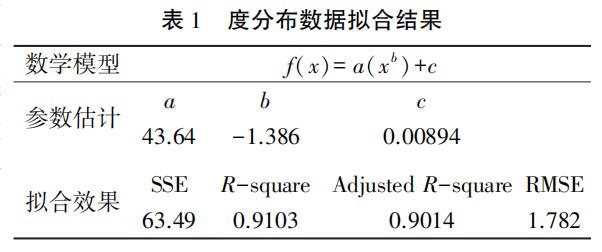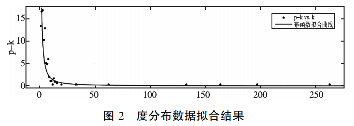 首先,对个人数据传播网络进行度分布分析,得出度分布概率密度图,并进行度分布拟合,挖掘度分布特征。采用Matlab进行幂函数拟合,结果见表1。拟合优度(置信度为 95%)见图2。