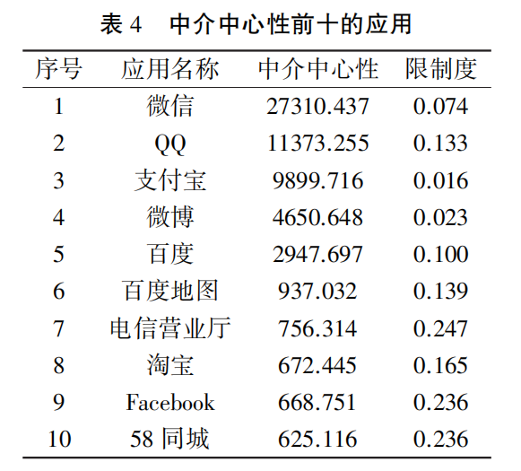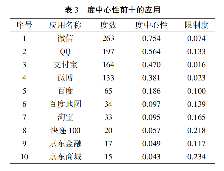 其一,通过度中心性和中介中心性分析获取关键节点。度中心性(degree centrality,DC)可以反映一个应用在个人数据传播网络中的参与程度;中介中心性(between centrality,BC)可以衡量一个应用对网络中资源流动的控制能力。经计算,排名前十的应用见表3、表4。