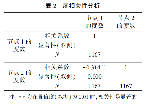 马克·纽曼基于度相关性的概念将网络划分为同配网络、异配网络,并提出计算方法。基于此,度相关分析结果见表2。由表2可见,个人数据传播网络的度相关呈低度负相关特征,即网络属于异配网络,度数大的节点与度数小的节点更倾向于互相连接,也就是说,在个人数据传播网络中,小型应用倾向于寻求与大平台合作,以获取更多数据;而大型应用平台也倾向于通过与小型应用合作,打造自己的生态圈,与其他大型平台形成竞争态势。