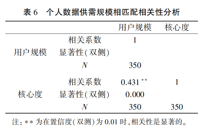 其次,个人数据供需规模相匹配的测量基于应用的核心边缘地位与其占有个人数据资源规模的匹配程度,越占据核心地位的应用,其个人数据规模应当越大。该匹配性采用应用的核心边缘地位与其占有个人数据资源规模的斯皮尔曼相关系数r2(-1≤r2≤1)为测量指标,相关系数越大,供需规模越匹配。相关分析结果见表6。