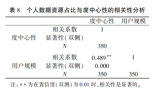 由表6可见,核心边缘地位与其占有个人数据资源规模的斯皮尔曼相关系数r2=0.431(P<0.01,N=350),二者具有中度的正相关性,标准化处理r2′=(r2+1)/2=0.7155。可见,个人数据传播网络中,应用的核心地位与其个人数据资源占有规模较为匹配。