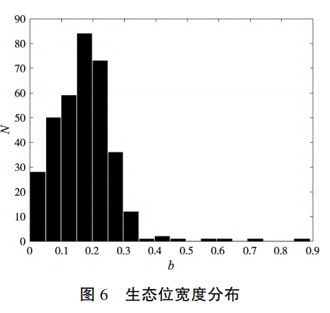 其中,bi为传播者i的生态位宽度(0≤bi≤1),k为传播者i的邻居节点规模,mj为节点i的邻居节点j与自己(m0)的个人数据资源存量,m为网络中个人数据资源的总量。经计算,350个应用的生态位宽度分布结果见图6。