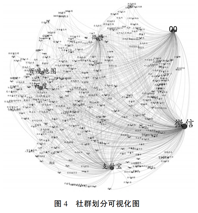 由图4可知,个人数据传播网络形成了5个主要的社群,这5个社群具有较大的规模(拥有较多的传播者)。5个社群分别是以微信、QQ、微博、支付宝、百度为核心的社群。其中,最大的社群是以微信为核心的社群,拥有108个成员,成为个人数据传播网络中的超级平台。从整体来说,个人数据传播网络的模块度值略低于0.3,表明个人数据传播网络具有一定的社群结构特征,但社群结构不够显著,这说明个人数据传播具有一定的社群内传播倾向,但个人数据传播在不同社群之间存在较多的共享、交换和使用行为,使得个人数据可以在不同社群中广泛传播。