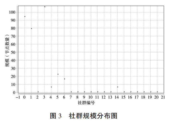 中观结构特征方面,本文采用Modularity模块度算法对个人数据传播网络开展社群分析。模块度(Q)的基本含义是社群内节点的连边数与随机情况下的边数之差的比值,Q值的范围在[-0.5,1)。当模块度Q接近0时,表明网络中不存在社团结构;随着模块度的增加,社团结构越来越清晰。当Q值在0.3~0.7时,说明社群结构划分明显。经计算,个人数据传播网络的模块度Q=0.271,并划分出21个社群,社群规模分布见图3、图4。