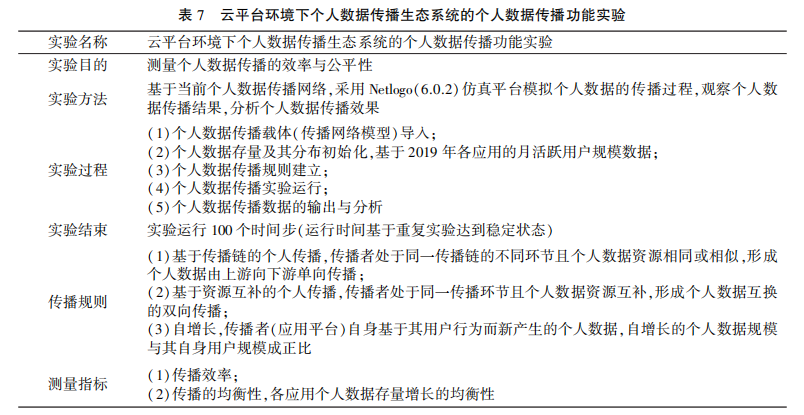 本部分基于静态网络结构,仿真个人数据传播的动态过程,研究个人数据传播的整体涌现结果,分析云平台环境下个人数据传播生态系统的个人数据传播功能。具体实验设计见表7。