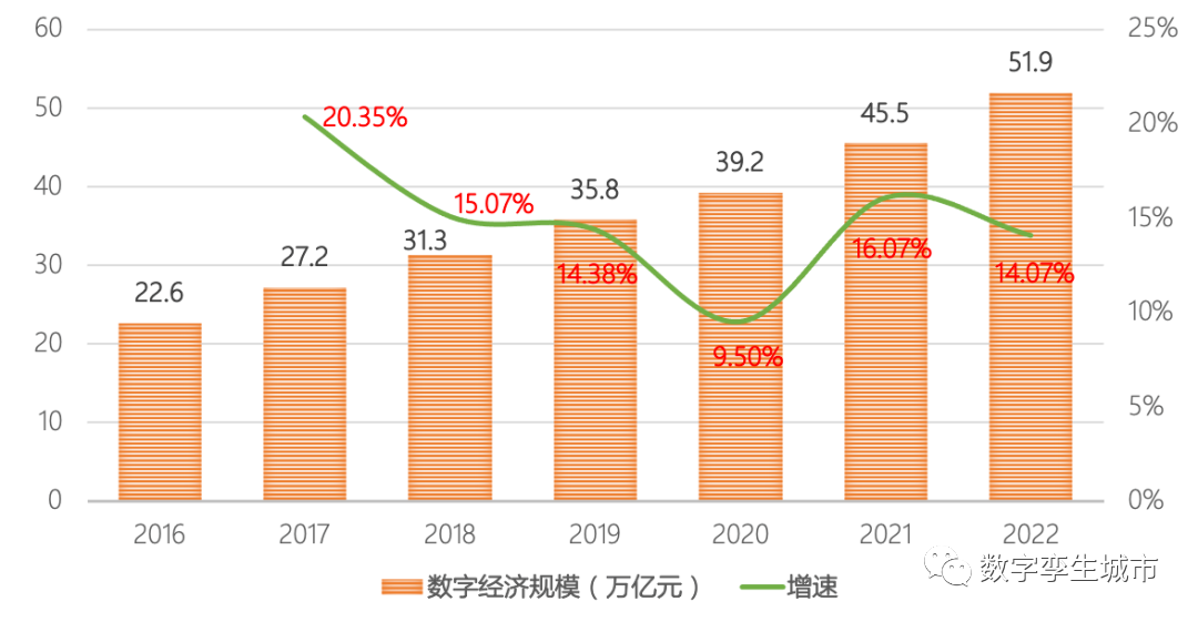 数字经济已经由经济的组成部分,转变为经济发展的引领力量,2022年7月,中国信息通信研究院(工业和信息化部直属科研事业单位)发布《中国数字经济发展报告(2022年)》,报告中指出,我国数字经济规模达到45.5万亿元,同比名义增长16.1%,高于GDP名义增速3.4个百分点,占GDP比重达到39.8%。公开数据显示,2022年我国数字经济的规模达到51.9万亿元,占GDP的比重达到了42.88%。数字经济增速达14.07%,显著高于同期GDP的平均增速,数字经济已经成为支撑经济高质量发展的关键力量。