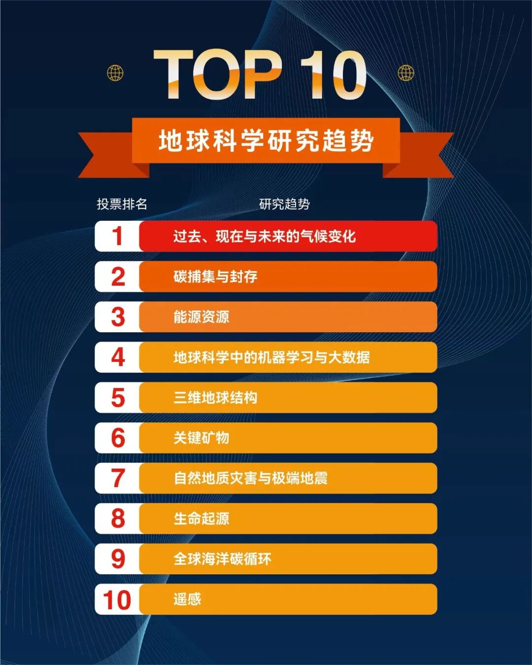 其他进入前十名的主题包括机器学习和大数据分析、地球三维结构、生命起源以及极端地震等自然地质灾害。