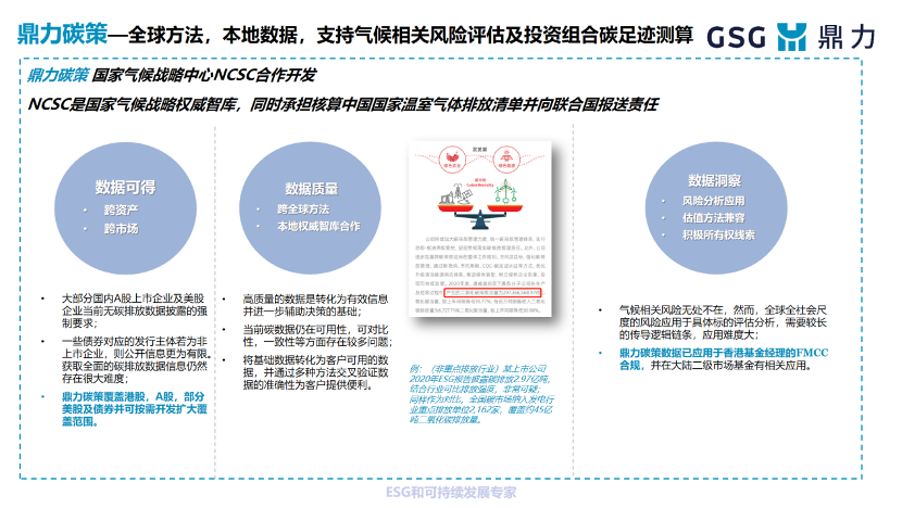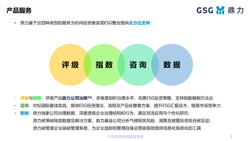 鼎力支持资管、金融机构整个ESG投资的能力建设,从正确的理念导入到制度流程政策的起草,再到方法论评价体系建立,提供全流程的ESG和可持续投资方案,并提供全面的ESG数据支持。