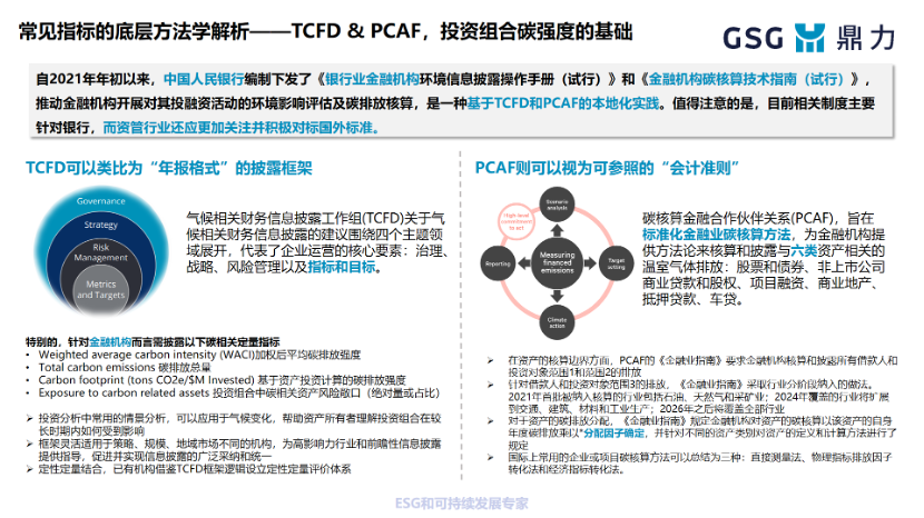 还有两项准则与投资组合相关,一个是TCFD,另一个是PCAF。TCFD由G20发起,20国峰会气候相关的工作由彭博公司来主持。简单来说,TCFD相当于气候披露相关的格式,涉及到从治理、战略、风险管理流程和指标目标四个层面。基金业协会规定的绿色投资披露或年报也和TCFD的架构方向趋同。我们需要这样的框架,否则披露绿色投资或者气候相关的信息时会产生许多不协调。
