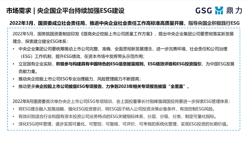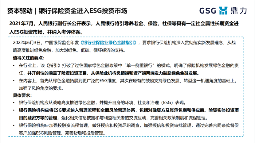 除了社保、政府引导基金,财政部也在支持和推动碳达峰工作,要求各地的政府领导基金要向这方面的倾斜。3月6日,银保监会发布《绿色金融指引》,明确要求在直接投资、间接投资过程中做ESG的调查。以前讲绿色金融多一点,但《绿色金融指引》直接引用环境、社会和治理这样的概念。央企也是如此,之前国资委一直强调企业的社会责任,从去年开始讲ESG。要求央企集团下属上市公司发布ESG的报告,我们鼎力公司也开始为央企在境内外ESG标准对接方面提供服务。
