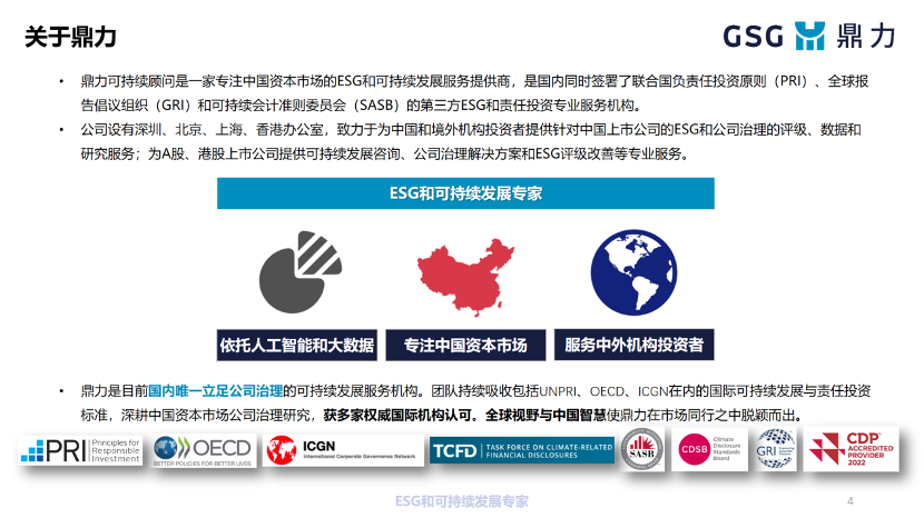 鼎力可持续数字科技是一家专注于ESG和绿色金融的ESG数据和碳管理SaaS提供商。鼎力为投资机构践行ESG和责任投资提供全方位数据和解决方案。包括对资产所有人和管理人提供责任投资的政策、制度、框架流程、ESG整合、积极股东和尽责管理等全套方案,也包括PRI、香港FMCC、欧盟SFDR等境内外资金方和监管要求的合规和应对。