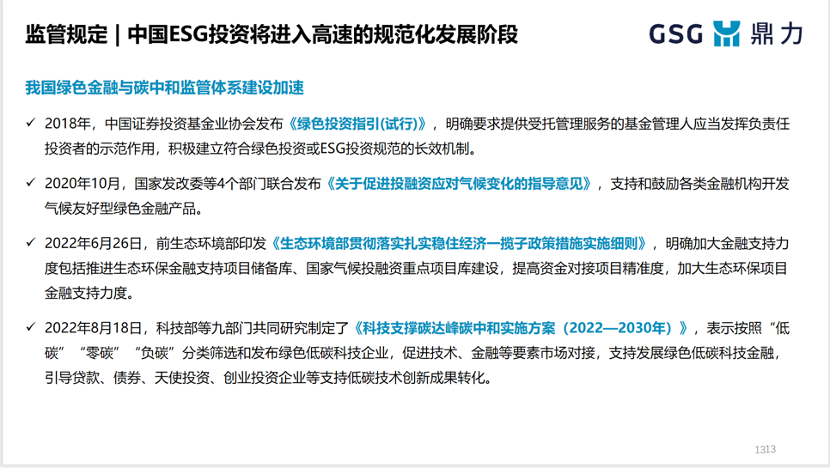 讲到监管驱动,我本人作为唯一市场第三方代表正在参与基金业协会对2018年发布的《绿色投资指引》的修订工作。可以向大家剧透的是,新政策将会分不同的类型对ESG基金提出要求,规范相应门槛。香港、欧洲市场已经开始进行严格监管,而且在欧洲和北美开始严厉打击漂绿行为。截至目前,中招的都是大资管机构,从高盛到德银下面的DWS,到英国的汇丰银行,还有纽约梅隆银行,因为在表述绿色或者ESG投资产品时有误导行为而被调查、被罚款。这是一个非常值得关注的趋势,希望引起我们金融机构的关注。