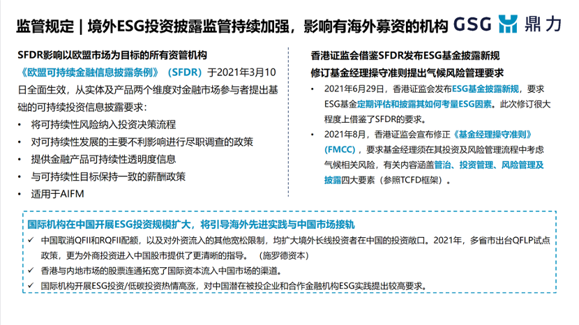 说到ESG/可持续投资推动力,一是资本的驱动,二是政策和法规的驱动。从全球来看,政策法规方面,欧洲是走在最前面的。我曾写文章介绍过2020年出台的《可持续金融披露条例》(SFDR),从两个角度与中国金融机构相关。