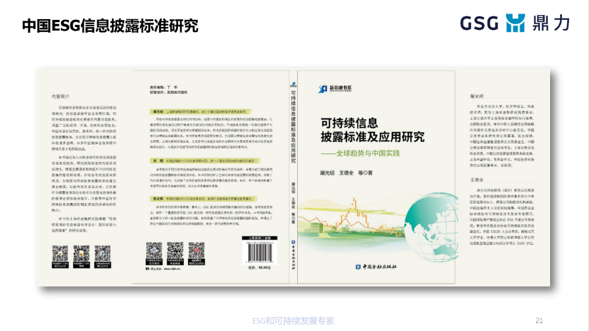 鼎力去年和上交所、深交所、中证指数以及社保做了一个研究课题。课题由上海新金融研究院支持,屠光绍理事长主持。鼎力团队作为主要执笔方参与了该课题的研究,《可持续标准信息披露标准及应用研究——全球趋势与中国实践》一书4月份已经出版,欢迎大家去官网查阅。书中对企业如何披露、按照何种标准披露、哪些信息能够帮助投资人做出更好的投资决策都有深入的研究。