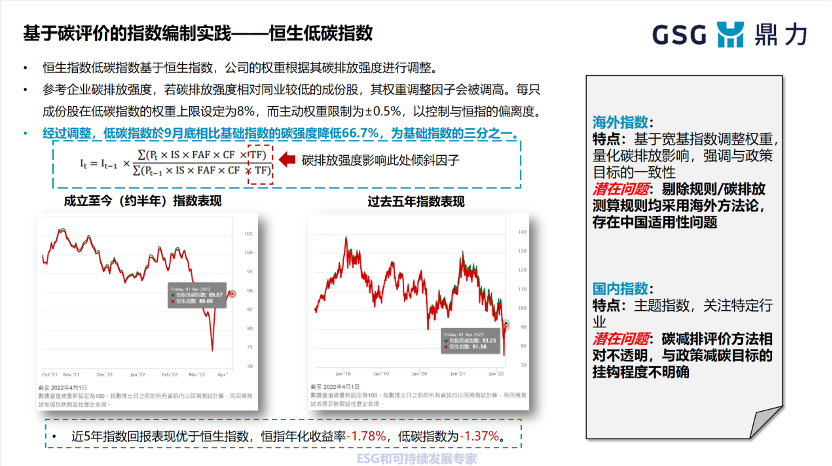 我年初曾和恒生指数的CEO交流过他们的低碳指数产品,她非常骄傲地告诉我恒指低碳指数。这个低碳指数是基于恒生的宽基指数来开发的,整个指数的成分股构成没有做任何调整,只是调整了宽基指数的股票权重,即将碳排放高的股票权重调低。结果显示,整个指数业绩表现没有受影响的前提下,组合碳排放水平降低将近66%,这是非常鼓舞人心的做法。所以低碳策略并不是说不能投资高碳行业、高排放行业,也不是说简单地抢投绿色资产。绿色资产是有限的,抢投会导致价格过高。转型过程中,金融机构既要考虑ESG等可持续因素,也要为投资人带来回报。在这个过程中如何开展策略创新、产品创新是要展示真东西,考研硬功夫的。
