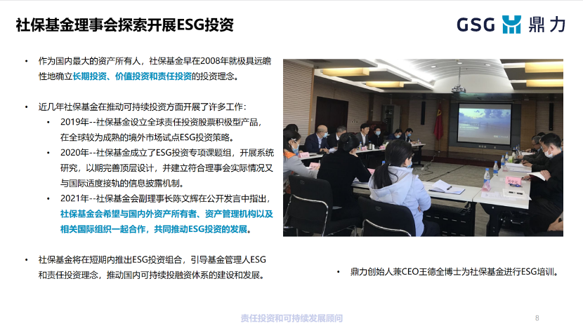 说到国外投资机构、养老金在行动,国内是一样的。我有15年的社保服务经验,今年年底社保将推出ESG投资组合,近几年一直在紧锣密鼓地研究。社保一直讲“长期投资、价值投资、责任投资”,二十几年平均年化收益率百分之八点几,这是非常骄人的成绩。其中,很重要的成功因素要看长线,这也证明ESG投资坚持长线投资是有优势的。