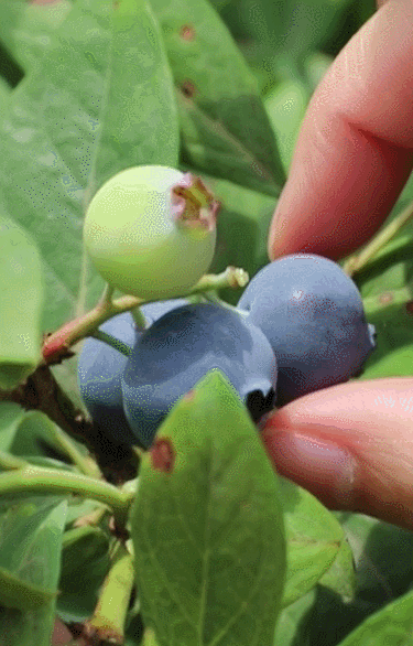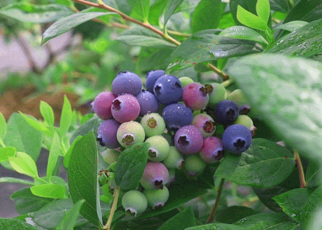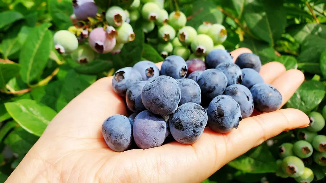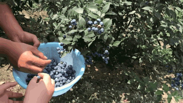 一棵棵蓝莓树上缀满了蓝紫色的果子