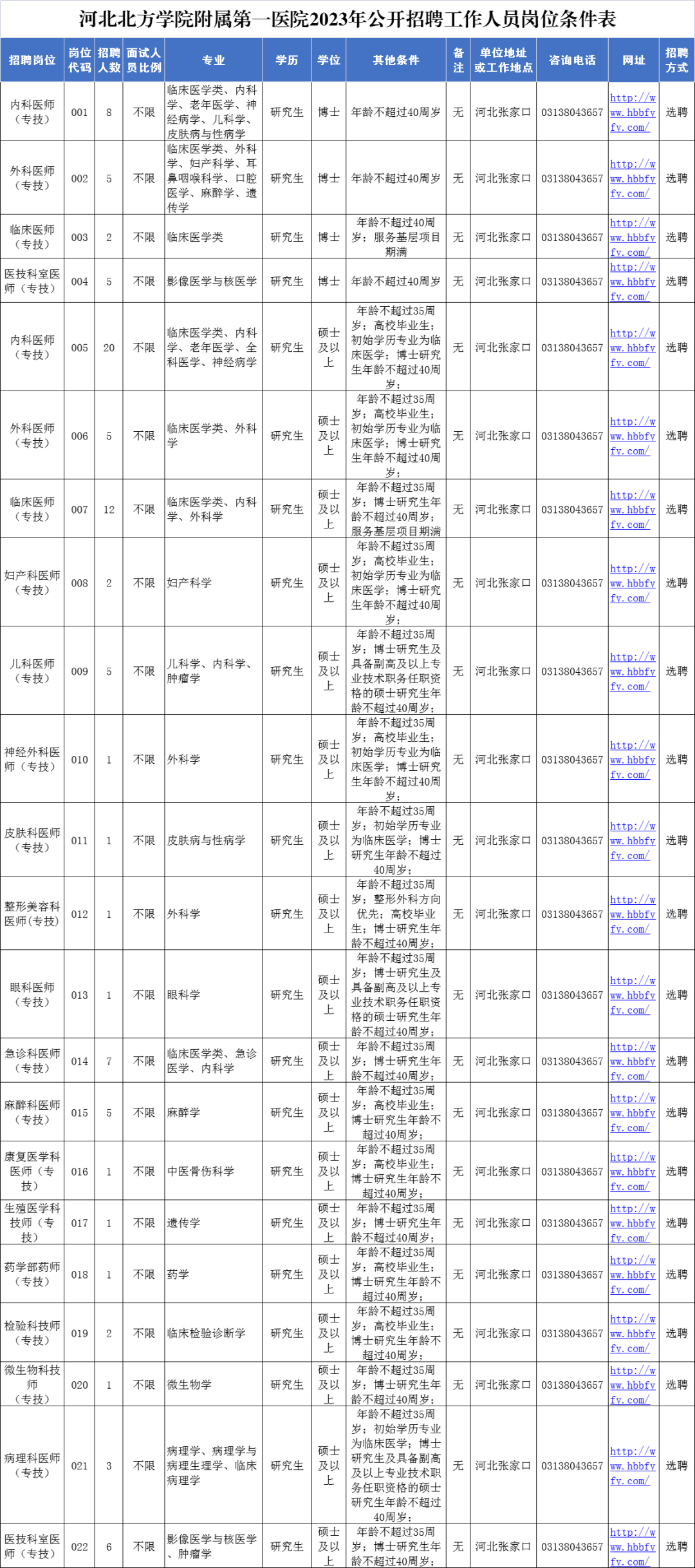 根据省委组织部、省人力资源和社会保障厅《河北省事业单位公开招聘工作人员暂行办法》(冀人社发〔2011〕9号)文件精神,结合我单位2023年招聘工作人员计划和岗位空缺情况、工作需要,拟采取选聘方式招聘工作人员95名,制定选聘方案如下:坚持德才兼备,贯彻民主、公开、竞争、择优的原则,在测评、考核的基础上择优聘用。4、具有与招聘岗位要求相适应的年龄、学历学位、专业或技能条件;7、18-35周岁(1988年6月29日至2005年6月29日期间出生)。博士研究生及部分紧缺专业具备副高及以上专业技术职务任职资格的硕士研究生年龄可放宽到40周岁以下(1983年6月29日以后出生)。2023年河北北方学院附属第一医院拟选聘工作人员95名,其中博士20人、硕士75人。具体要求详见《河北北方学院附属第一医院2023年选聘工作人员岗位条件表》(附件1)。其中专业参考教育部《授予博士、硕士学位和培养研究生的学科、专业目录》、《普通高等学校本科专业目录》、《普通高等学校高职高专专业参考目录(试行)》等设置。本次招聘部分岗位用于专项招聘“高校毕业生”,包括以下人员:(1)纳入国家统招计划、被普通高等院校录取的持有《普通高校毕业就业协议书》的2023年高校毕业生。(2)国家统一招生的2021年、2022年普通高校毕业生离校时和在择业期内未落实工作单位,其户口、档案、组织关系仍保留在原毕业学校,或保留在各级毕业生就业主管部门(毕业生就业指导服务中心)、各级人才交流服务机构和各级公共就业服务机构的毕业生。(3)参加“服务基层项目”前无工作经历,服务期满且考核合格后2年内未落实工作单位的人员。(4)普通高等院校在校生或毕业当年入伍,退役后(含复学毕业)2年内未落实工作单位的退役士兵。(5)2023年取得国(境)外学位并完成教育部门学历认证的留学回国人员,以及2021年、2022年取得国(境)外学位并完成教育部门学历认证且未落实工作单位的留学回国人员。服务基层项目用于专项招聘大学生村官、农村教师特岗计划、“三支一扶”计划、志愿服务西部计划、北京2022年冬奥会和冬残奥会赛会志愿者等项目服务期满人员。符合招聘条件的港澳台居民,均可报名应聘相应岗位,需取得祖国大陆承认的学历。现役军人、试用期内的公务员和试用期内的事业单位工作人员、未满最低服务年限或未满约定最低服务期限的人员、在读的非应届毕业生,不在招聘范围。曾因犯罪受过刑事处罚和被开除公职的人员、失信被执行人,以及法律法规规定不得招聘为事业单位工作人员的其他情形人员,不得报考。此外,应聘人员不得报考聘用后即构成回避关系的招聘岗位。2、硕士研究生,须按期毕业并同时取得毕业证书及学位证书。1.邮箱报名。报名人员同时填写《报名表》(附件2)与《信息表》(附件3),将两张表压缩成一个文件包以附件形式发送至邮箱bfyfyzp@163.com。2.报名时间:2023年6月29日-2023年7月7日17:00。3.报名要求:每名报考人员只能选择报考一个岗位。所有应聘人员邮件主题须以“岗位代码+姓名+出生年月+最高学历+所学专业”的方式命名,例:“007+张三+1994.01+硕士研究生+外科学”。报考人员应保证所提供的各种材料和信息真实、准确,凡本人填写信息不真实、不完整或填写错误的,责任自负;如发现有弄虚作假、舞弊等行为,一经查实,立即取消考试资格及选聘资格。请考生保持报名时所留联系电话的畅通,以便通知有关事宜。我单位根据岗位条件要求,对报名人员信息进行资格初审,随后电话通知初选符合条件的报名人员参加医院组织的资格复审、测评、考核。参加资格复审人员需准备以下材料:《报名表》(粘贴近期小二寸白底免冠近照)、简历、身份证原件及复印件、毕业证原件及复印件(自高中以来所有毕业证书、2023年应届毕业生未取得证书,自行打印学信网学籍证明)、学位证原件及复印件(自大学以来所有学位证书)、资格证原件及复印件和其他相关材料原件及复印件。考核内容:由医院选聘工作领导小组组成测评考核组,采取对其学习工作经历、主持或参与的科研课题和发表的论文论著等情况进行综合评价,以投票的方式决定是否录用,得票数需达到测评考核组成员2/3及以上票数。依据得票数从高到低顺序,按计划招聘人数与进入体检人选1:1的比例确定体检人选。比例内末位人选得票数相同的,进行再次投票,直至选出拟招聘人选,随后在我院官网公示选聘岗位及入围人员基本信息。