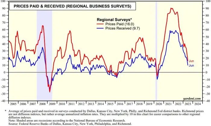 亚德尼说:“根据美联储五家地区联储银行进行的地区商业调查,6月份的平均支付价格和接收价格指数显示,通胀压力继续迅速消退。”