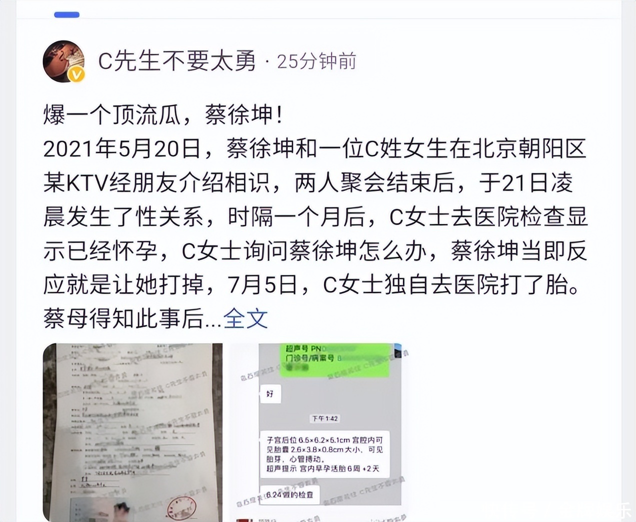 首先C女士明确指认蔡徐坤,说到了打胎的事情;