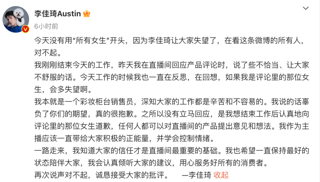 “有问题大家指正出来了,佳琦也认识到了自己的错误出来道歉了,散了吧,人非圣人,孰能无过。”
