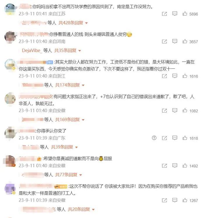 评论区中,大部分网友并不买账,高位热评内容大部分是这样的:“你挣着普通人的钱,到头来嘲讽普通人贫穷”“你得承认你变了”“别忘了来时路吧”“赚钱已经赚到忘本了”“真的不想做就退休吧,起码还给大家留个好印象,这样看着太不讲究了”“你已经没有普通打工人的心态了,赚到钱就飘了呗”