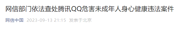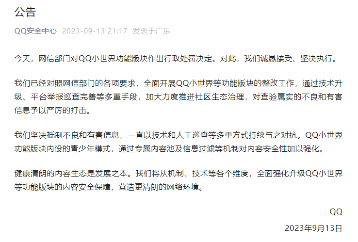 cription-url="https://mmbiz.qpic.cn/mmbiz_gif/DibT4pHeibubMJlOOWLvu7H49oKHUEw2ZclqmGibOnHbTplox06cMYhF421kqFvevgibGqTN3943W4Vk73agccjGJA/640?wx_fmt=gif" data-copyright="0" data-ratio="0.11875" data-src="https://mmbiz.qpic.cn/mmbiz_gif/KH5h60vCVpiclZxxGb7ibWH3QnQHOUqibolRwwWO5QAMcZ2xnthVuTbvsEDEAnn9GBR4ISyoxkHBJJ8r6uF22o1aA/640?wx_fmt=gif" data-type="gif" data-w="640" style="font-family: -apple-system-font, BlinkMacSystemFont, "Helvetica Neue", "PingFang SC", "Hiragino Sans GB", "Microsoft YaHei UI", "Microsoft YaHei", Arial, sans-serif;background-color: rgb(255, 255, 255);font-size: 16px;text-align: center;letter-spacing: 0.54px;width: 677px;box-sizing: border-box !important;overflow-wrap: break-word !important;visibility: visible !important;" />据“网信中国”9月13日消息,近日,针对腾讯QQ平台“小世界”版块存在大量色情等违法信息,危害未成年人身心健康问题,国家网信办指导广东省网信办,依法约谈腾讯公司相关负责人,依据《未成年人保护法》第一百二十七条,实施行政处罚,责令暂停“小世界”版块信息更新30日,没收违法所得并处100万元罚款。腾讯QQ平台“小世界”版块存在大量色情引流信息,部分用户在评论区诱导未成年人不良交友、实施性引诱,招募未成年人进行游戏陪玩,严重侵害未成年人合法权益,危害未成年人身心健康,违反《未成年人保护法》第八十条。网信部门将持续聚焦严重侵害未成年人合法权益、危害未成年人身心健康的违法违规问题,加大对屡错屡犯问题网站平台的执法力度和公开曝光频度,努力为未成年人营造健康安全的网络环境。今天,网信部门对QQ小世界功能版块作出行政处罚决定。对此,我们诚恳接受、坚决执行。我们已经对照网信部门的各项要求,全面开展QQ小世界等功能版块的整改工作,通过技术升级、平台举报巡查完善等多重手段,加大力度推进社区生态治理,对查验属实的不良和有害信息予以严厉的打击。我们坚决抵制不良和有害信息,一直以技术和人工巡查等多重方式持续与之对抗。QQ小世界功能版块内设的青少年模式,通过专属内容池及信息过滤等机制对内容安全性加以强化。健康清朗的内容生态是发展之本。我们将从机制、技术等各个维度,全面强化升级QQ小世界等功能版块的内容安全保障,营造更清朗的网络环境。