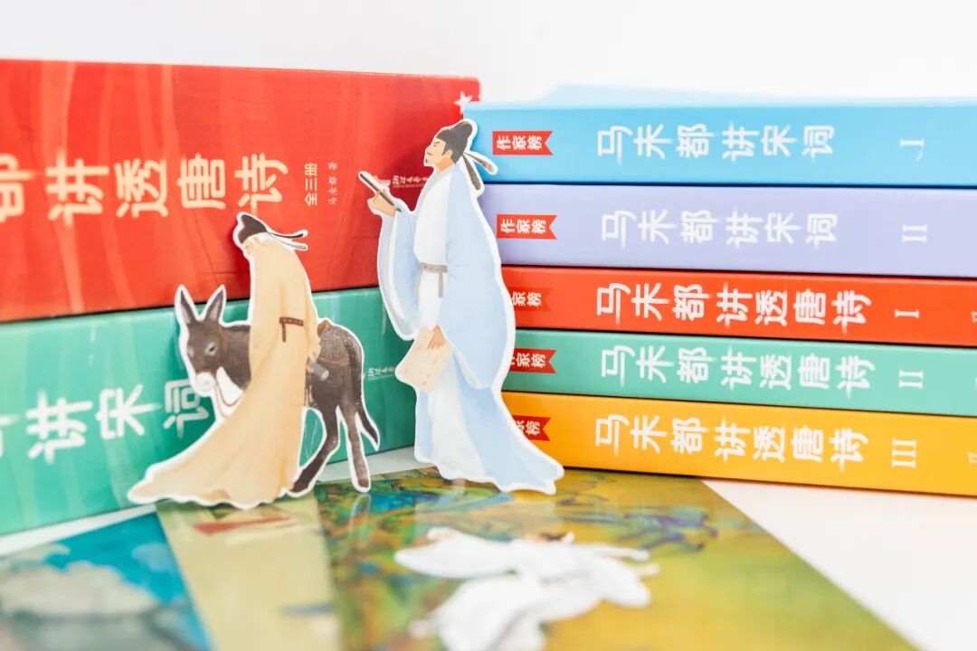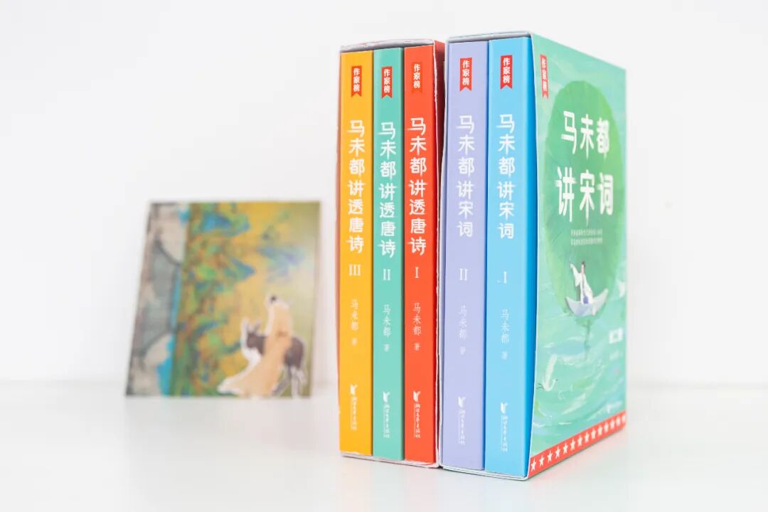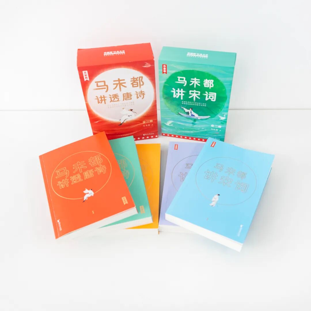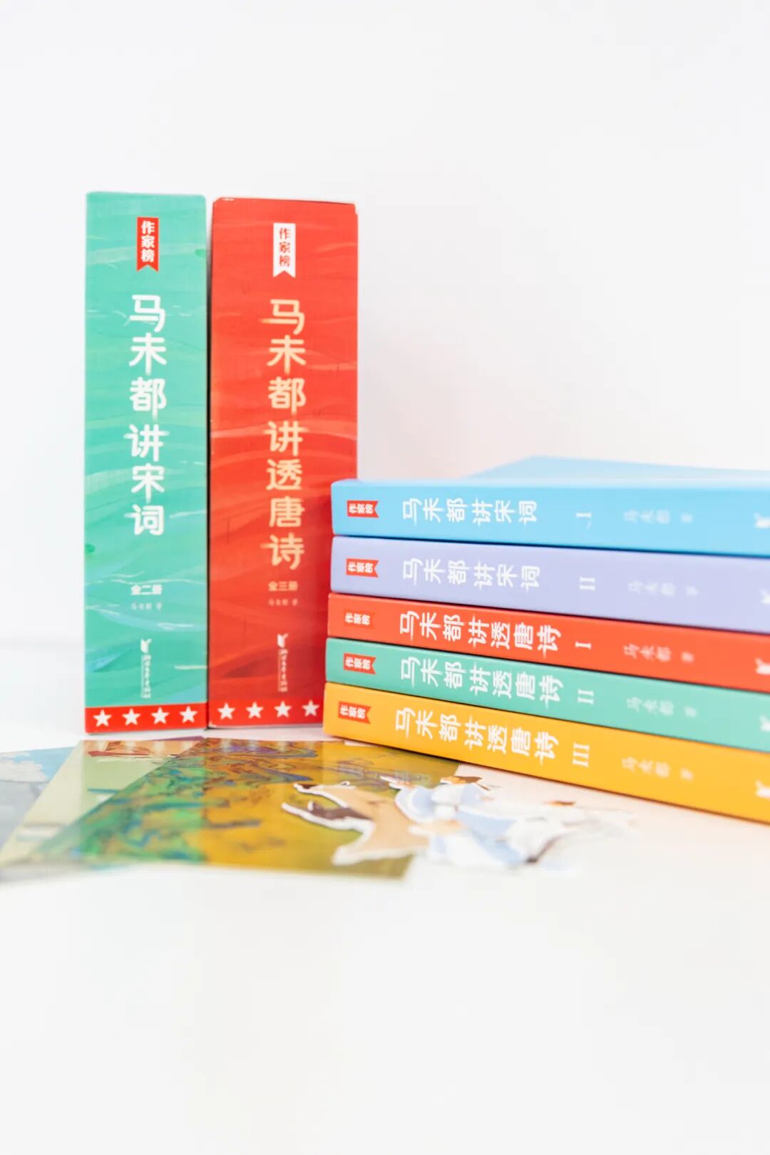 通过读唐诗宋词,孩子可以在生活中获得一份淡定与从容。市面上讲解诗词的书籍特别多,为什么我们推荐每个人都要入手一套“马未都讲唐诗宋词”?除了作者马未都是文化界大神,这套书的出品方“作家榜”,也是无数爱书人眼中的”中国图书界的天花板“。马未都的这套书是用讲故事的独特方式,为读者讲述李白、杜甫、王维、白居易、李清照、苏轼、柳永等110位诗人诗作的精髓。我们仿佛就回到了千年前的唐宋,见证了各位大诗人词人的成长,能够清晰知道,他们在写下这首作品的当下,社会背景是怎样的,他们都经历了些什么,心情是如何的。语言生动有趣,通俗易懂有代入感,能让读者迅速进入到情境当中,就像在听故事,古文零基础也能轻松读懂。在娓娓动人的讲述中,马未都旁征博引,融合了丰富的历史人文知识,这也跟他一直研究文物、有着常人难以企及的历史文化知识积累有关。每每讲到动情处,他也会跟读者分享自己真实透彻的人生感悟,让读者看后若有所思、若有所得。为了给读者更好的阅读体验,这套书精选唐代至近现代超过500幅中国历代传世书画作品。包括宋徽宗、唐寅、赵孟頫、仇英、陈洪绶、石涛、恽寿平、文徵明等。其中不仅有南唐画家顾闳中的《韩熙载夜宴图》、明代画家仇英的《汉宫春晓图》等经典名画,还有唐玄宗李隆基的《鹡鸰颂》等书法名作。所有书画文物都是高清全彩呈现,堪称艺术品级别的“纸上博物馆”。古诗词中经常会出现一些生僻字,每每读诗被卡住,总会兴致缺缺。为了让您和您的孩子可以无障碍阅读,本书给每首古诗词和生僻字都加了注音。全书精编精排,图文并茂,将传世名画和文字融合起来,美得像艺术品。版式疏朗悦目,书中的每首诗都按句断行,用彩色字体标出,排版清晰,浅浅翻来就令人心旷神怡。套装一共5册图书,每册书的封面颜色采用了中国传统经典色,典雅又时尚。整套书采用精美书盒包装,唐诗封面灵感来自于李白“月下独酌”,热烈的红色体现大唐美学。宋词封面灵感来源于李清照“争渡,争渡,惊起一滩鸥鹭”,清雅的绿色呈现宋代美学。书中名画众多,本书还精选了5幅制作成精美的明信片,送给大家欣赏与收藏。分别取材自名画赵孟頫《秋山仙弈图》、任熊《晓风残月》、王希孟《千里江山图》、仇英《汉宫春晓图》、赵佶《瑞鹤图》另外,书中还赠送5枚异型书签,分别是李白、杜甫、白居易、苏轼、李清照的形象,阅读氛围瞬间拉满。